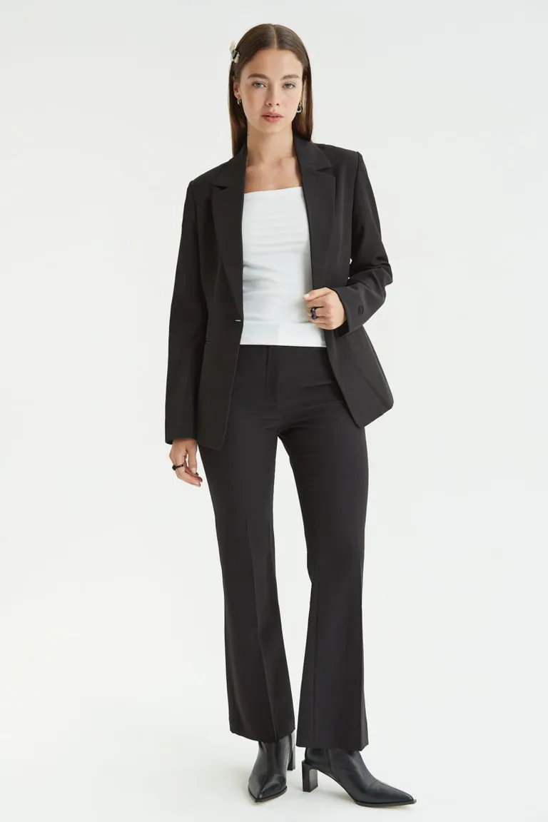 Blazer sastrero de corte recto con hombreras, diseño con cuello de solapa clásica, cierre frontal con un botón, bolsillos ojal y pinzas de entalle para un calce elegante. Ideal para combinar en conjuntos formales o casuales, ofreciendo una estructura impecable y versátil para el día a día.