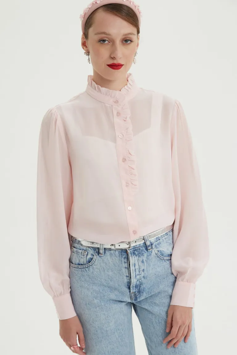 Blusa femenina de calce recto, diseñada con cuello mao y delicados volados frontales. Presenta un diseño de mangas largas con puños estructurados y detalle de frunces en los hombros, aportando volumen y estilo. Es una prenda versátil ideal para combinar en diferentes ocasiones, aportando un toque de distinción al guardarropa diario.