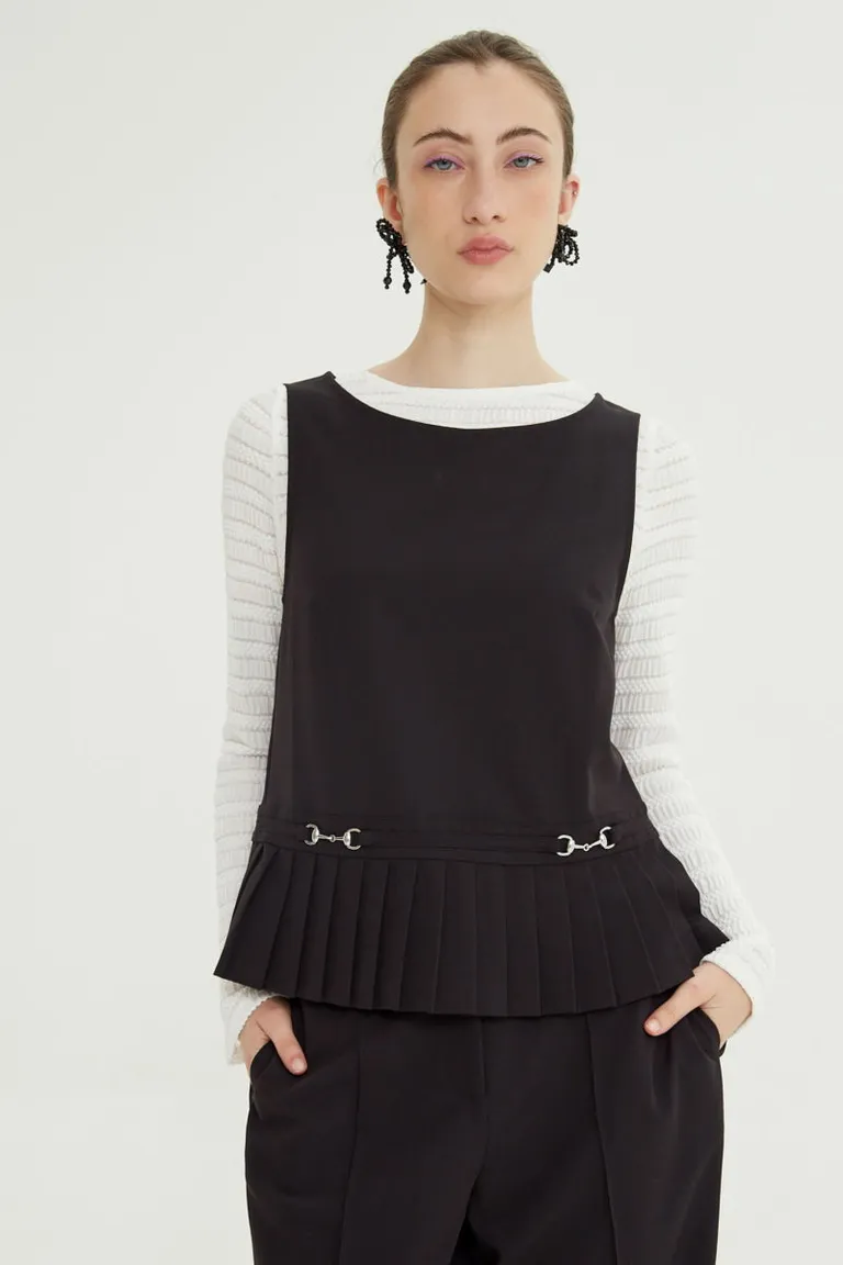 Blusa sastrera sin mangas con detalle de tablas en la cintura y apliques metálicos. Presenta un diseño de calce cómodo a la cadera, con escote a la base y cierre en la espalda. Una pieza versátil y elegante para combinar en diversos conjuntos.