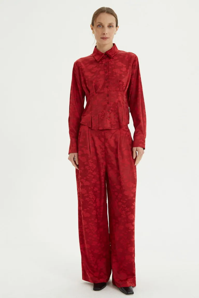 Camisa de jacquard con motivo floral, diseño entallado con pinzas delanteras y traseras. Presenta cierre frontal con botones, cuello clásico y mangas largas. El ajuste en la espalda permite adaptar la silueta para mayor comodidad. Una prenda versátil ideal para combinar en diferentes ocasiones.