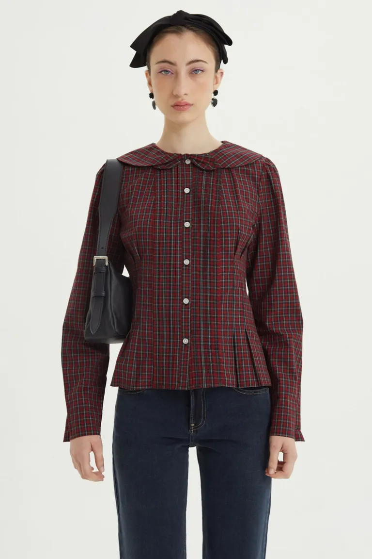 Camisa de corte entallado con diseño a cuadros. Presenta cuello redondo tipo marinero, cierre frontal con botones y detalles de frunces en los hombros. Una prenda versátil y clásica con un estilo distintivo, ideal para complementar conjuntos casuales o urbanos.