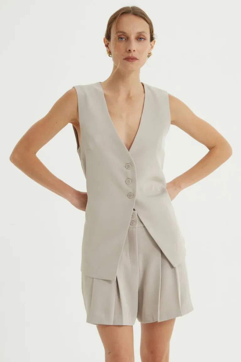 Chaleco sastrero con escote en V y cierre frontal mediante botones. Su diseño entallado aporta una estructura definida a la silueta, ideal para completar equipos de oficina o propuestas de estilo formal. Presenta un largo que sobrepasa la línea de la cadera, ofreciendo una estética sofisticada y contemporánea que se integra con facilidad en distintos looks de uso diario.
