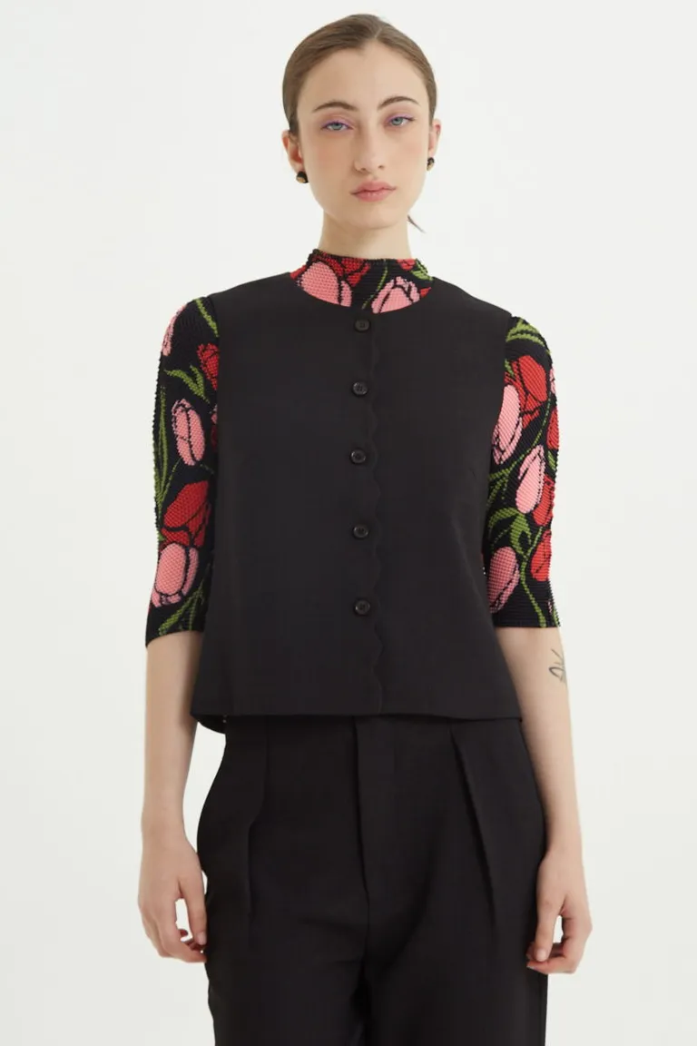 Chaleco sastrero de corte recto con escote redondo y cierre frontal de botones. Presenta un diseño distintivo con terminaciones onduladas en el frente. Una prenda versátil y sofisticada para integrar en equipos formales de oficina o para elevar looks casuales cotidianos. Su estructura clásica permite múltiples combinaciones para renovar el guardarropa con un toque distintivo.