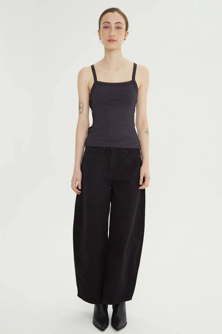 Musculosa de ajuste al cuerpo con escote cuadrado y breteles finos. Presenta un diseño moderno con aberturas laterales unidas por ganchos metálicos, ideal para un look casual y versátil. Su largo alcanza la primera cadera, brindando comodidad y un calce entallado perfecto para diversas ocasiones.