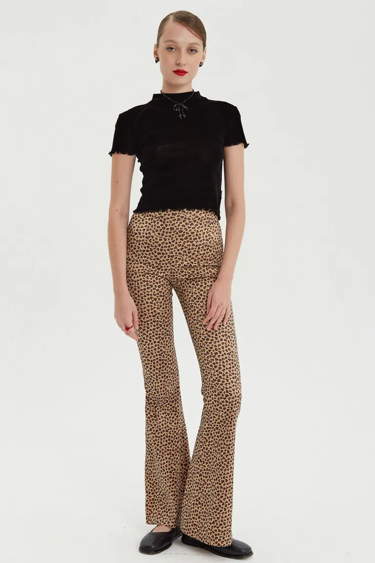 Pantalón de tiro alto con corte acampanado y diseño de estampado animal print. Presenta cierre lateral oculto y ajuste entallado con pinzas traseras para una silueta definida. Ideal para combinar con prendas básicas o destacar en conjuntos urbanos, ofreciendo un estilo moderno y versátil para diversas ocasiones.
