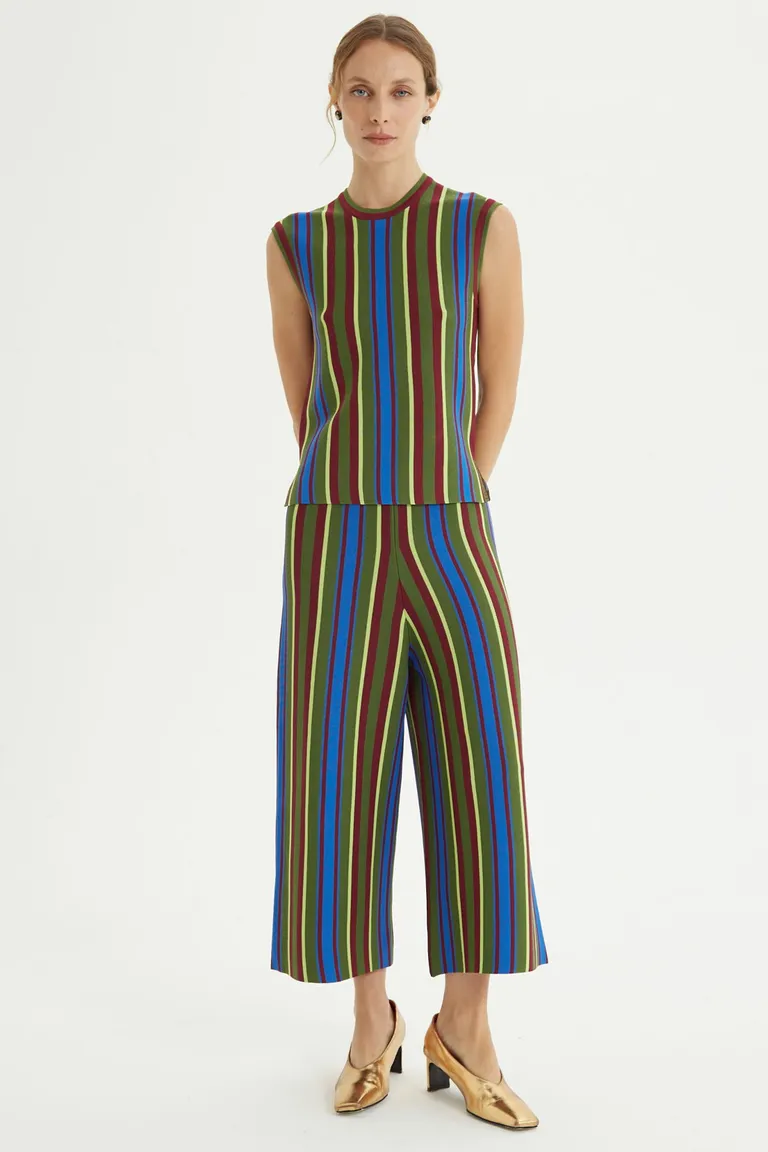Pantalón de punto con diseño de rayas verticales. Presenta tiro alto, cintura elastizada y un corte de pierna ancha con largo cropped, ideal para lograr looks urbanos y cómodos con un estilo distinguido.