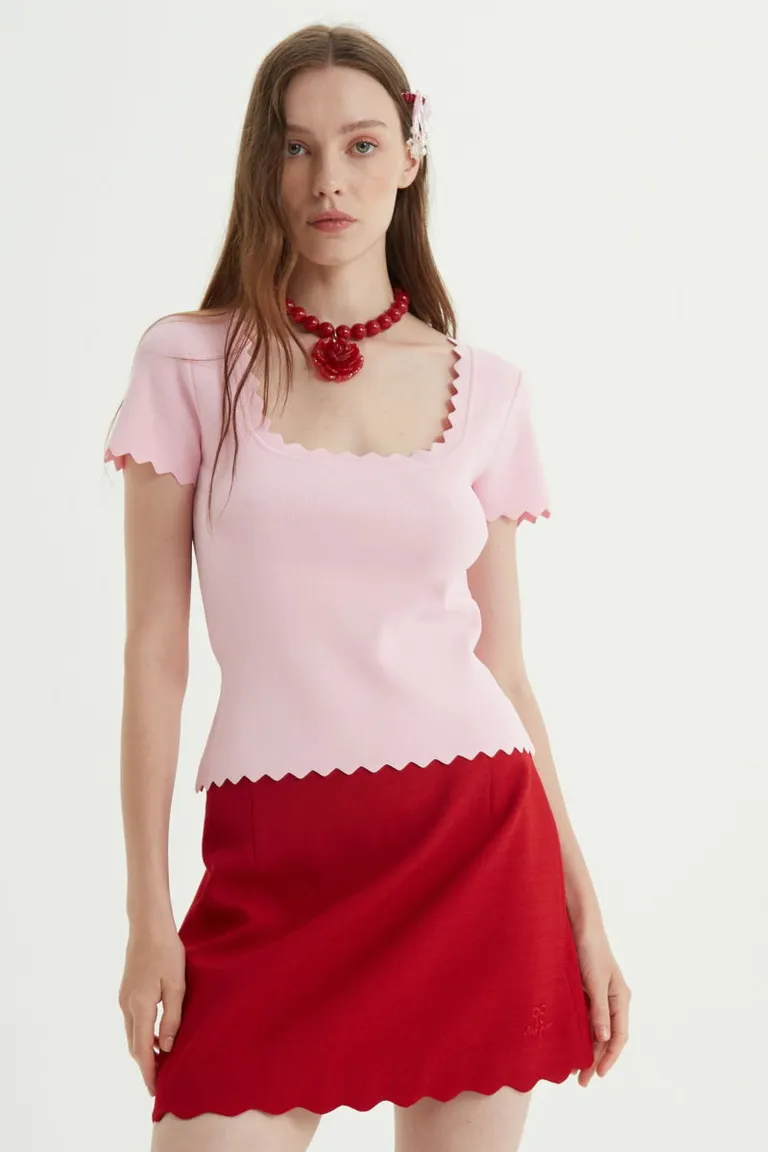 Remera de tejido liviano con cuello cuadrado y detalles de terminaciones onduladas en mangas y ruedo. Diseño de corte recto con calce cómodo, ideal para un estilo femenino y versátil. Una prenda esencial para incorporar en outfits diarios con un toque diferenciado.