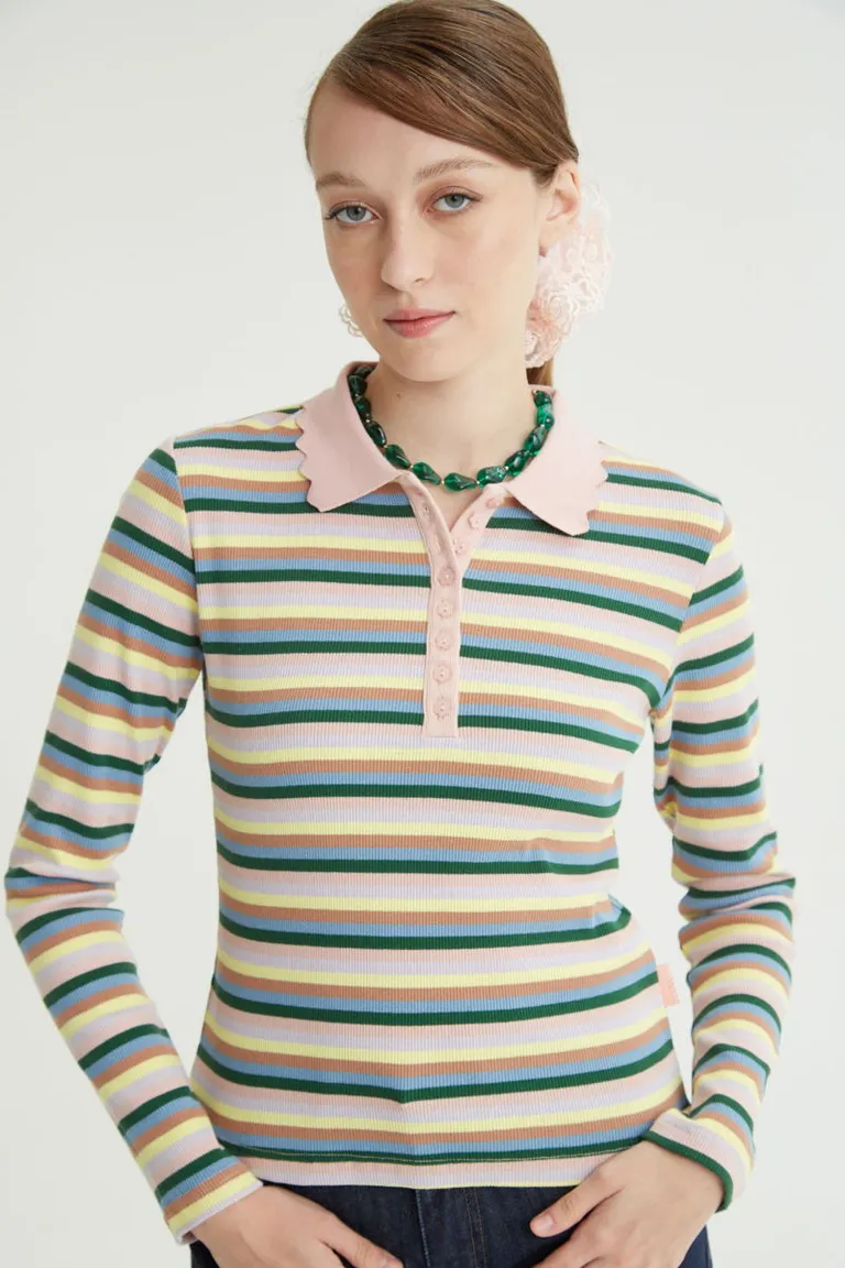Remera de manga larga con diseño de rayas y cuello polo. Esta prenda presenta un calce al cuerpo y detalles en el cuello con terminación de ondas y botones decorativos. Ideal para complementar diferentes estilos y ocasiones, brindando comodidad y versatilidad para el uso diario.