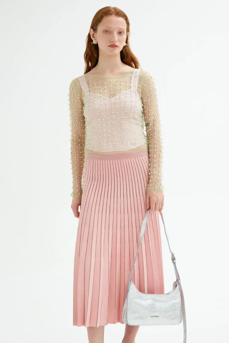 Remera de manga larga confeccionada en microtul, presenta un delicado diseño con perlas y strass bordados en toda la prenda. Cuenta con un corte recto a la altura de la cadera y escote redondo clásico, ideal para completar outfits de noche o eventos especiales con un toque sofisticado y distinguido.
