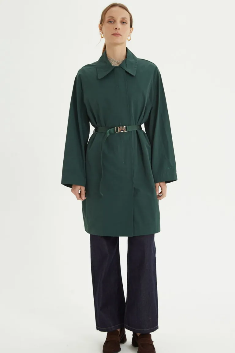 Saco liviano con silueta recta y largo por arriba de las rodillas. Presenta cuello en punta, bolsillos laterales y cierre frontal con broches a presión. Incluye un cinturón tejido ajustable con hebilla metálica. Su diseño minimalista permite integrarlo fácilmente a diversos conjuntos urbanos para el uso diario.