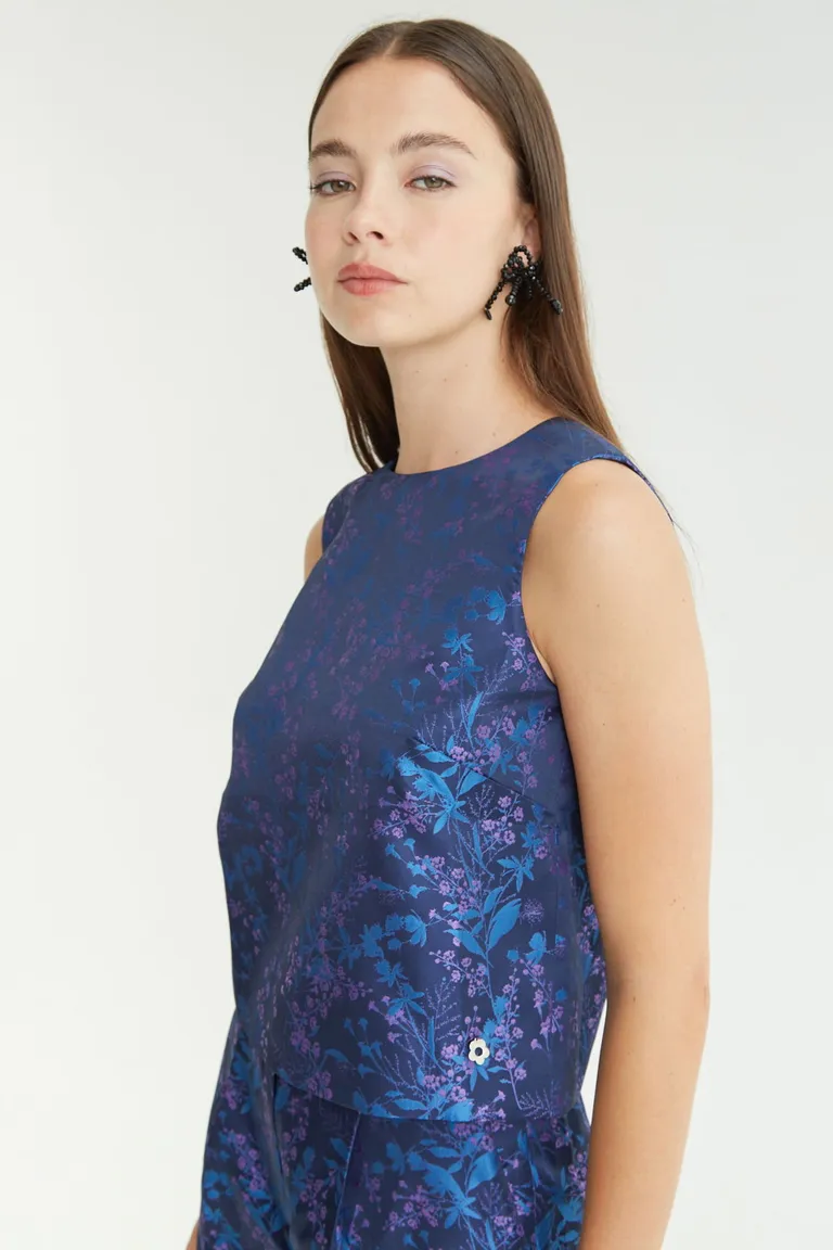 Top sin mangas con diseño estampado floral y cuello redondo. Presenta un corte cómodo que se ajusta a la figura con elegancia. Una prenda versátil y delicada para renovar tus conjuntos diarios con un estilo sofisticado y moderno. Ideal para combinar tanto con prendas formales como casuales, aportando distinción en cada ocasión.