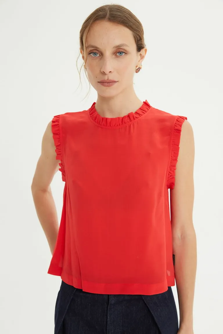 Top sin mangas con detalles de volados en cuello y sisas. Presenta un corte recto y holgado con largo a la cadera, cuello redondo, pinzas frontales y cierre con botones en la espalda. Una prenda versátil y delicada, ideal para combinar en equipos casuales o para eventos formales, aportando un toque distintivo y femenino a cualquier conjunto diario.