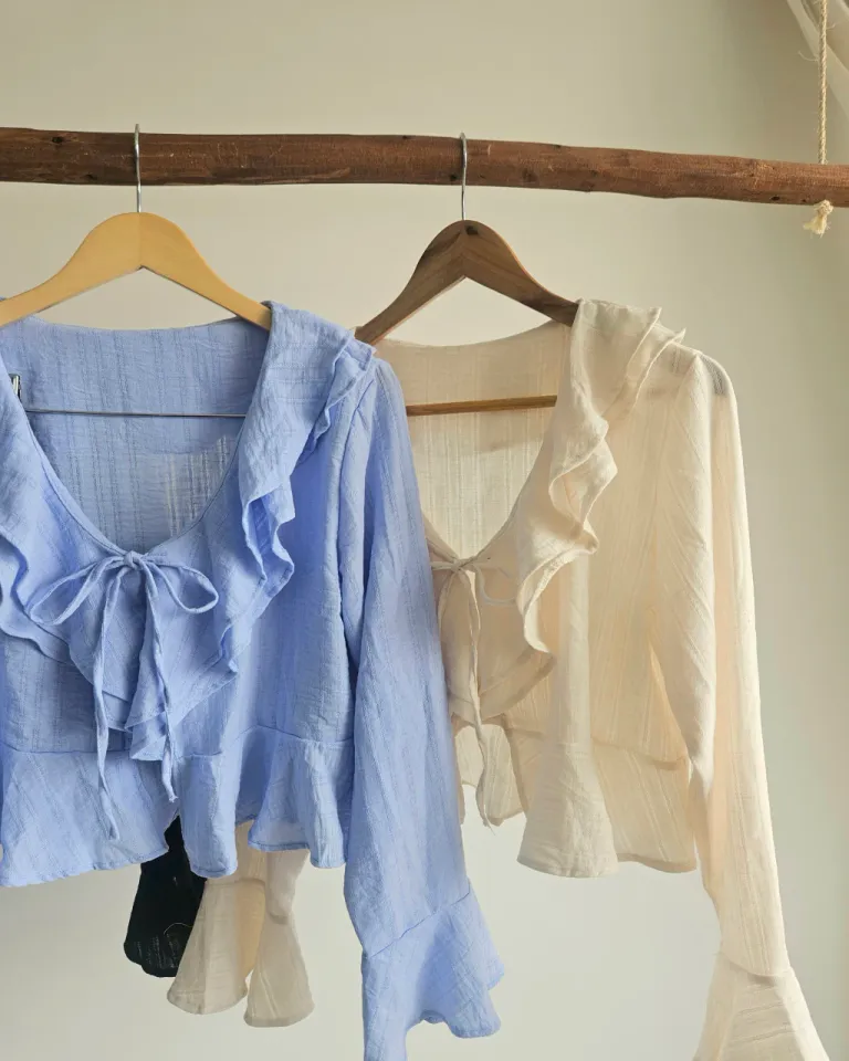 Esta elegante blusa con volado y tira para atar es perfecta para cualquier ocasión. Su diseño femenino y versátil la convierten en una prenda imprescindible en tu armario. Combina fácilmente con diferentes prendas y accesorios para crear looks increíbles.