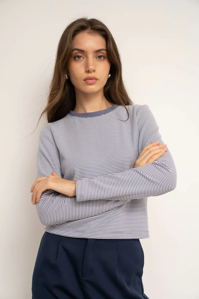 Remera básica de diseño versátil con rayas horizontales y cuello redondo liso. Corte clásico que se adapta perfectamente al cuerpo, ideal para looks casuales y combinaciones diarias. Disponible en talles M y L, perfecta para todas las temporadas del año.
