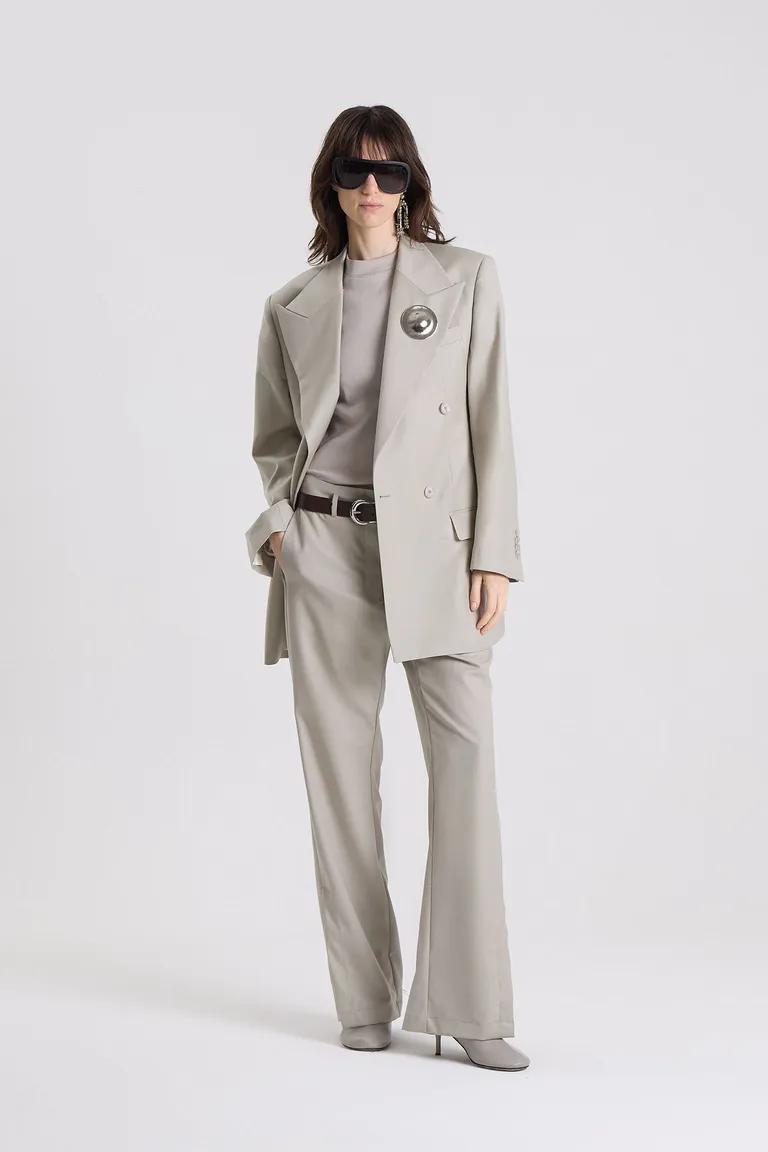 Saco sastrero de líneas definidas con solapas amplias y hombros marcados. Presenta una silueta estructurada que aporta presencia y sofisticación a cualquier conjunto. Incluye un prendedor metálico decorativo como detalle distintivo en el frente. Ideal para quienes buscan una prenda versátil de corte formal y elegante para combinar en diferentes ocasiones.