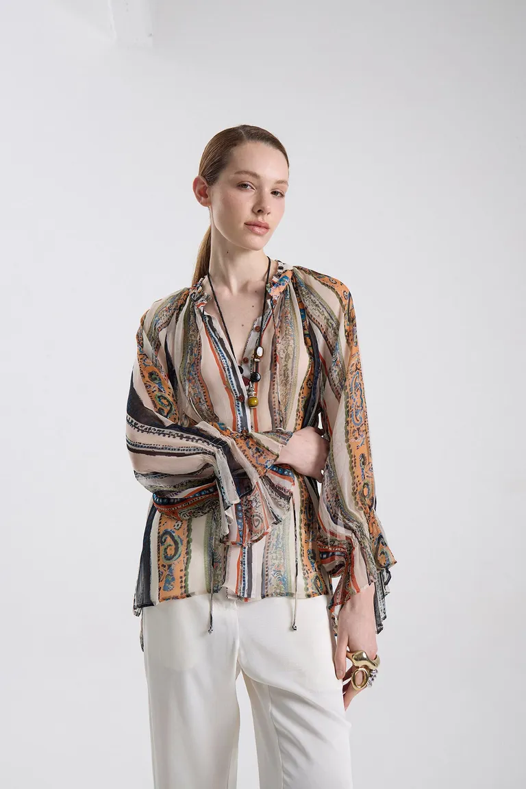 Blusa de calce holgado con diseño estampado, mangas amplias y cuello mao con detalle de volado. Una prenda versátil de silueta fluida y femenina que incorpora botones en la parte delantera, ideal para elevar el estilo cotidiano con un toque distintivo.