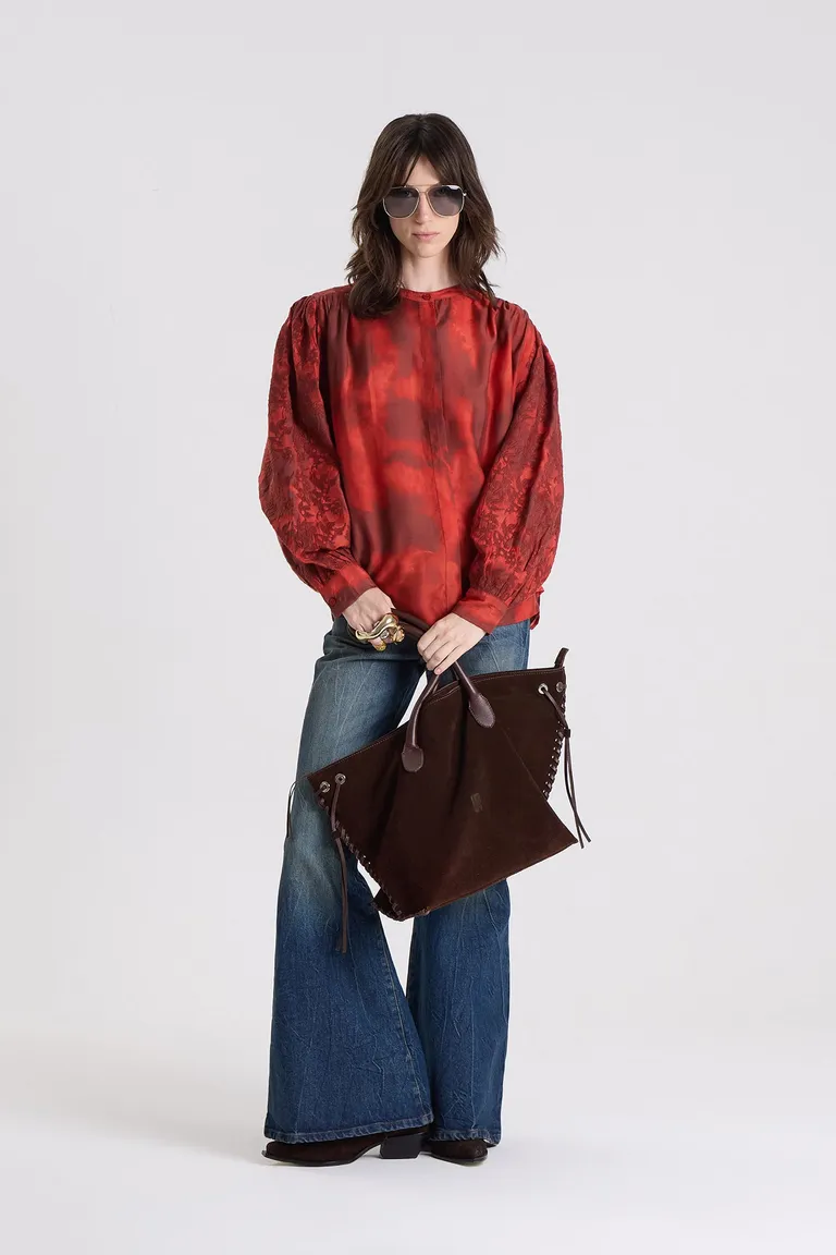 Blusa holgada de mangas largas tipo balloon con detalles de bordados en mangas y espalda de Maria Cher