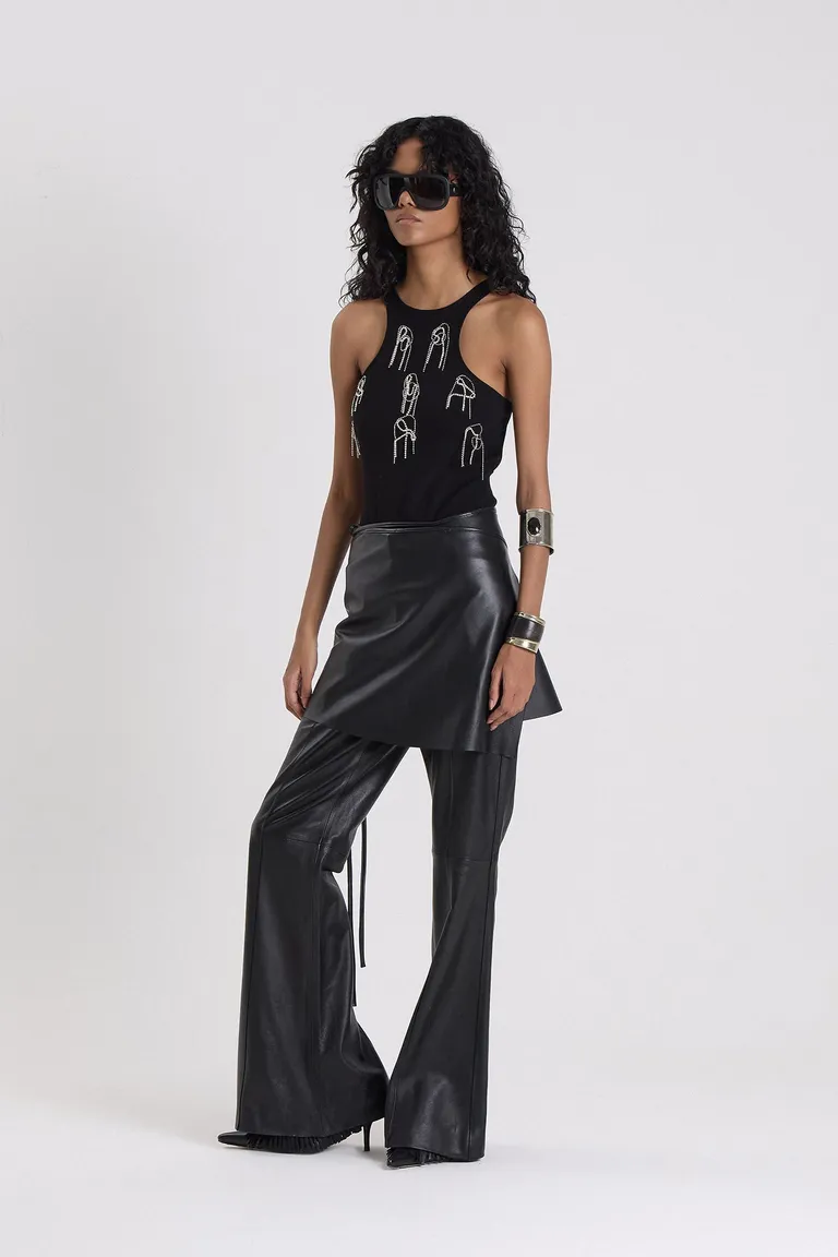 Body de cuello halter con diseño sin mangas y espalda descubierta. La prenda presenta detalles bordados a mano con cadenas de strass en el frente, aportando un toque distintivo. Una pieza versátil y moderna, ideal para completar equipos con estilo propio.