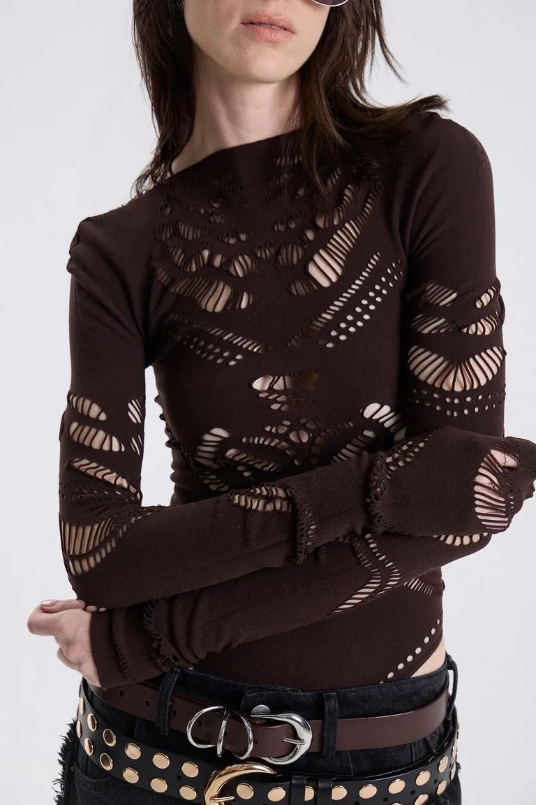 Body de manga larga con diseño de cuello cerrado, presentando un estilo distintivo con detalles de calados estratégicos en toda la prenda. De ajuste ceñido al cuerpo, es una pieza versátil que aporta textura y modernidad a cualquier conjunto urbano, ideal para combinar con prendas de tiro bajo.