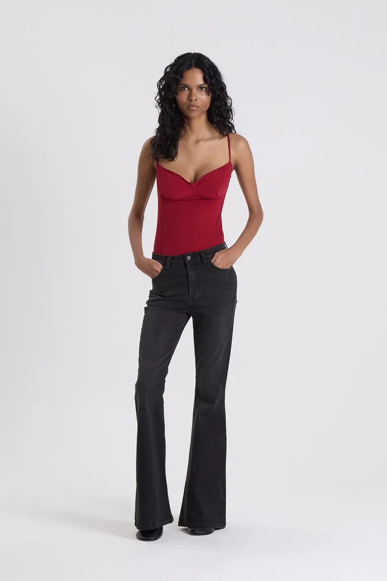 Body de diseño entallado con escote tipo lencero y breteles regulables. Presenta un estilo inspirado en la corsetería con detalles de recortes y vivos aplicados. Cuenta con cierre mediante broches en la parte inferior para mayor comodidad. Una prenda versátil ideal para integrar en outfits casuales o elegantes.
