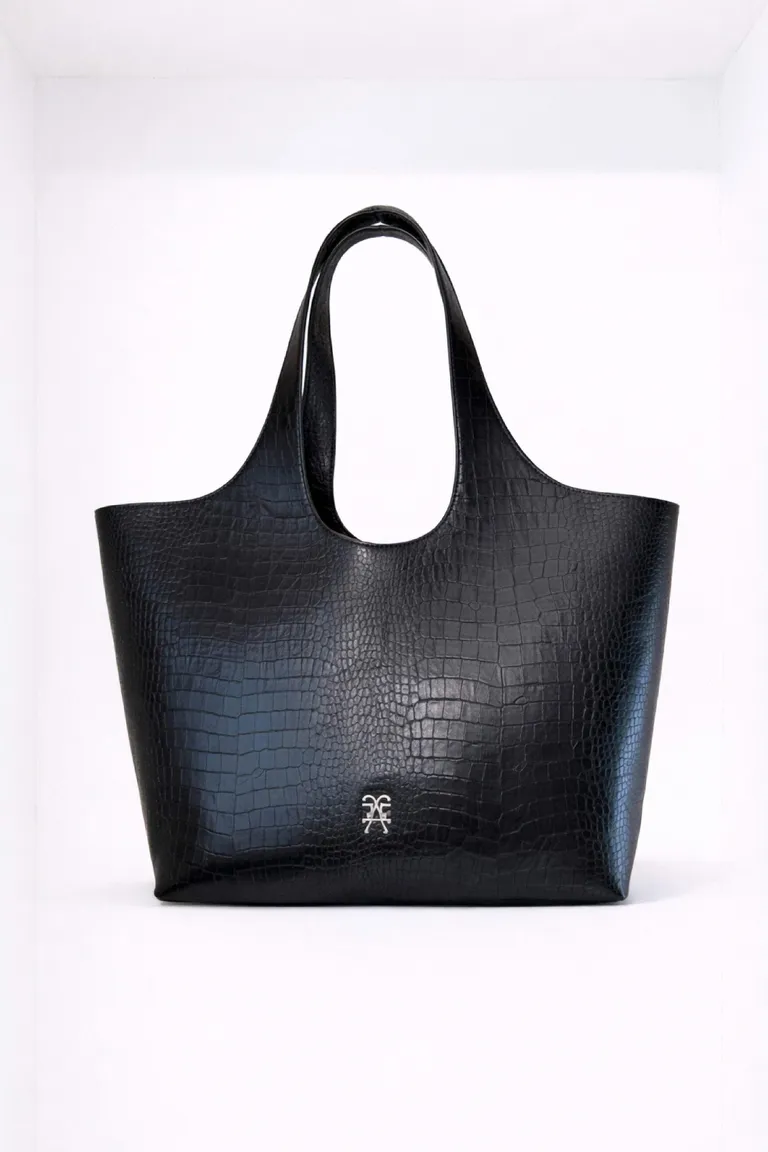 Cartera tipo tote con textura de relieve, diseño espacioso con cierre mediante botón snap y compartimento interno. Posee un forro interior y cuenta con detalle metálico de marca en el frente.