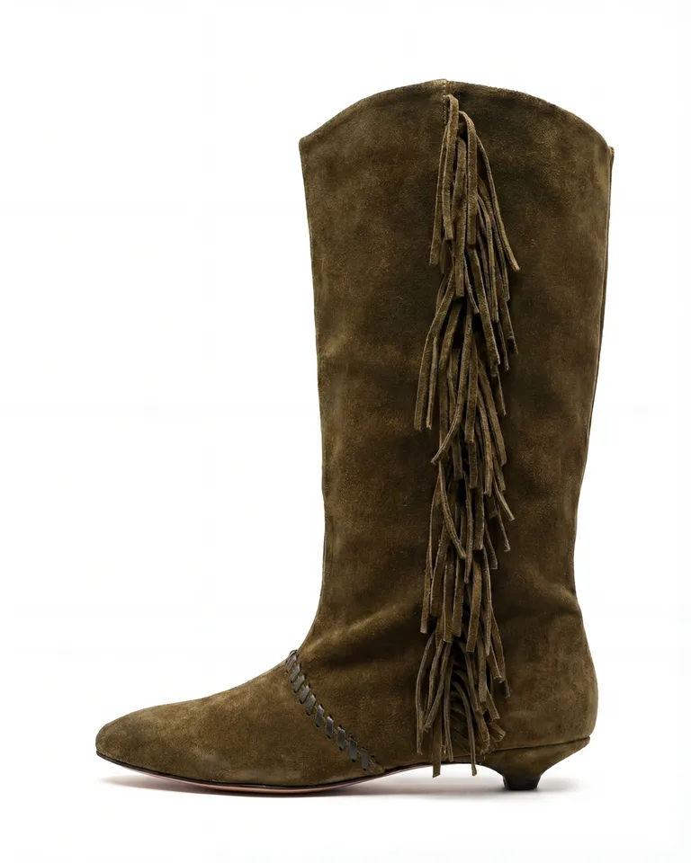 Bota de caña media con detalle de flecos laterales y costuras a la vista en la parte frontal. Presenta una silueta clásica con taco bajo, ideal para completar equipos con un estilo folk o urbano. Su diseño cuenta con una terminación en punta redondeada que aporta comodidad para el uso diario.