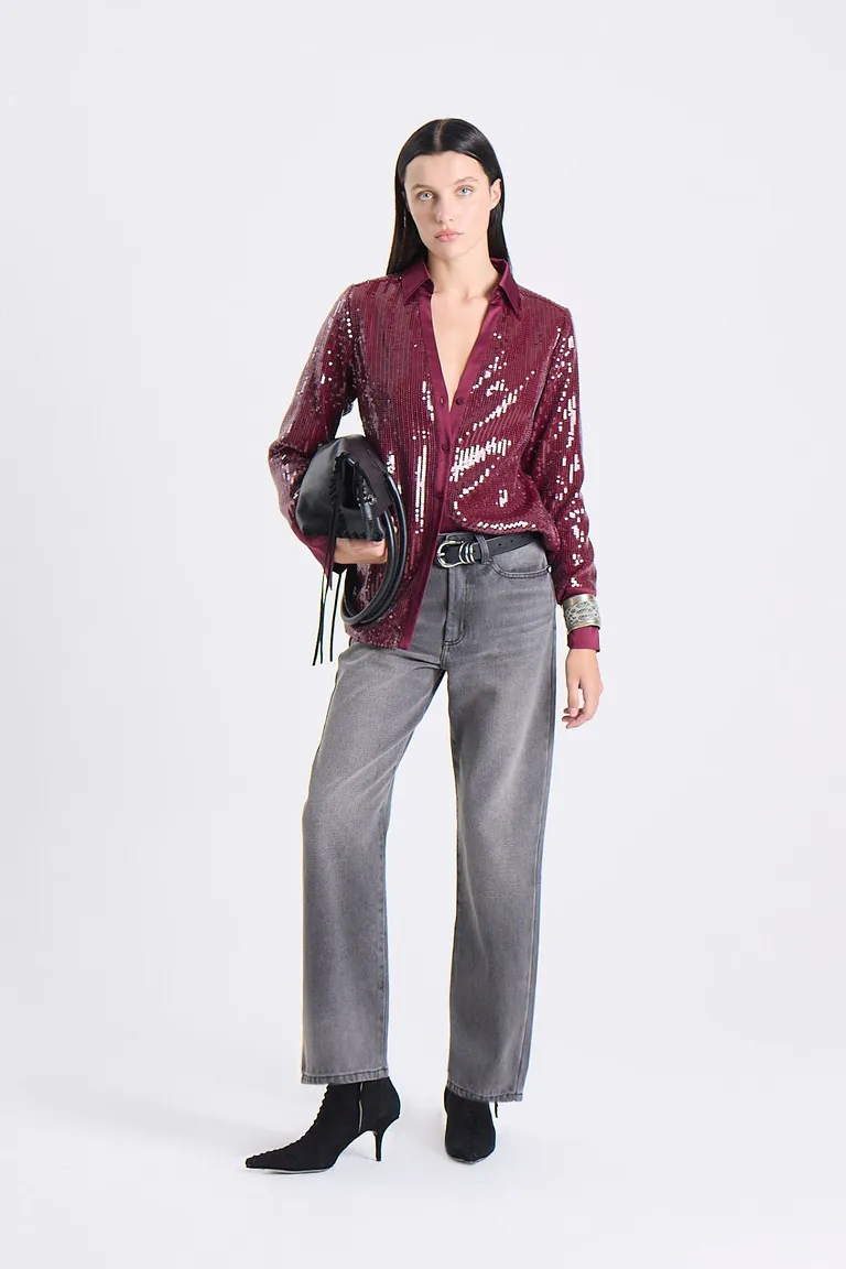 Camisa de corte clásico con cuello tradicional, cartera de botones y puños ajustados. Presenta una superficie recubierta de lentejuelas que aportan textura y luminosidad a la prenda. Con un entalle suave en la cintura, ofrece un diseño versátil ideal para integrar en looks formales o de noche con un toque sofisticado.