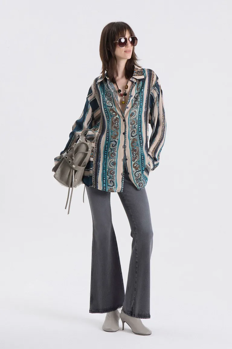 Camisa de corte amplio y holgado con cuello camisero clásico y cierre frontal mediante cartera de botones. Presenta un diseño con motivos geométricos y lineales en tonos naturales. Ideal para completar outfits casuales y modernos, ofreciendo una caída fluida y cómoda para el uso diario en cualquier temporada.