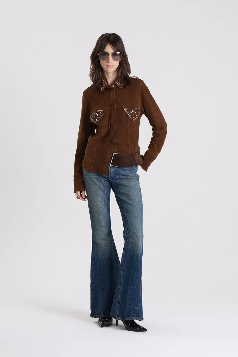 Camisa de corte estructurado con cuello clásico, cierre frontal por botones y detalles en bolsillos delanteros de Maria Cher