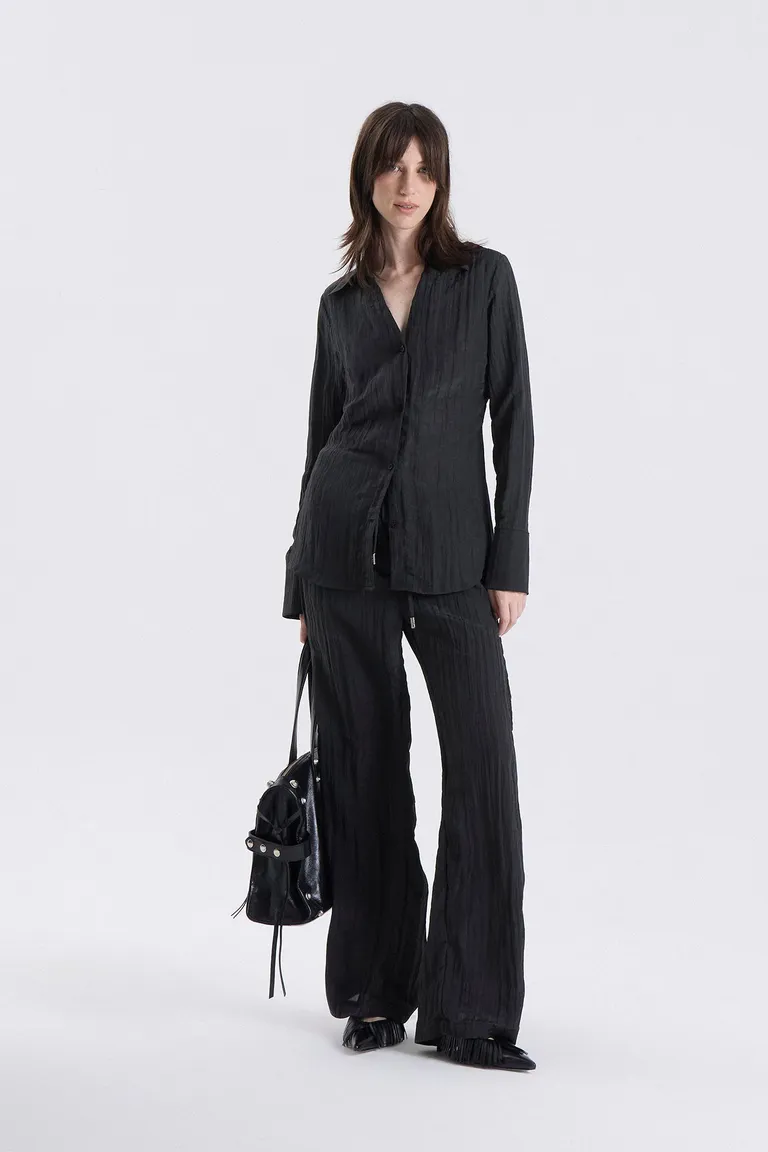 Camisa de corte clásico con cuello camisero, escote en v y cierre frontal mediante botones. Presenta un diseño de líneas verticales en relieve que recorre toda la prenda, incluyendo pinzas de entalle en la espalda para un ajuste definido. Ideal para complementar looks versátiles y urbanos durante todo el año.