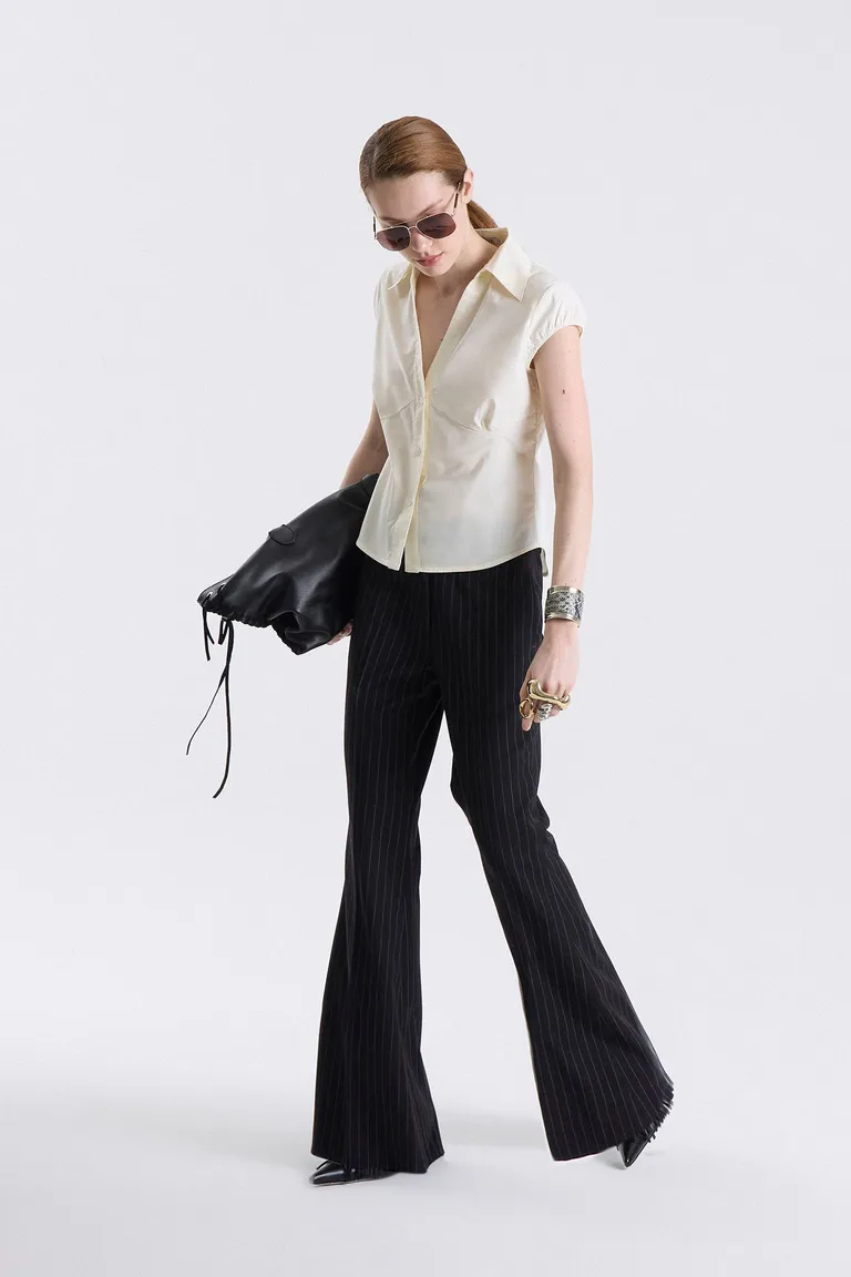 Camisa de corte entallado con diseño de silueta ajustada que incorpora recortes bajo el busto y delicados frunces para resaltar la forma natural del cuerpo. Esta prenda presenta una estética sofisticada y funcional, ideal para combinar en conjuntos diarios o situaciones de mayor formalidad, aportando un toque refinado a tu guardarropa.