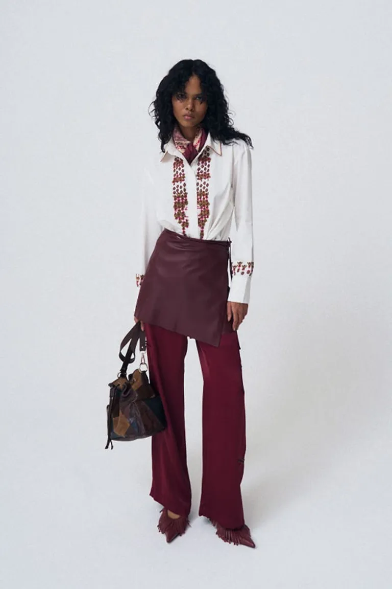 Camisa de corte clásico con manga larga, cuello camisero y cierre frontal por botones a tono. Se destaca por sus detalles de bordados artesanales aplicados en la zona frontal, el cuello y los puños, aportando un diseño distintivo a la prenda. Una pieza versátil para complementar looks casuales o formales con un toque de sofisticación.