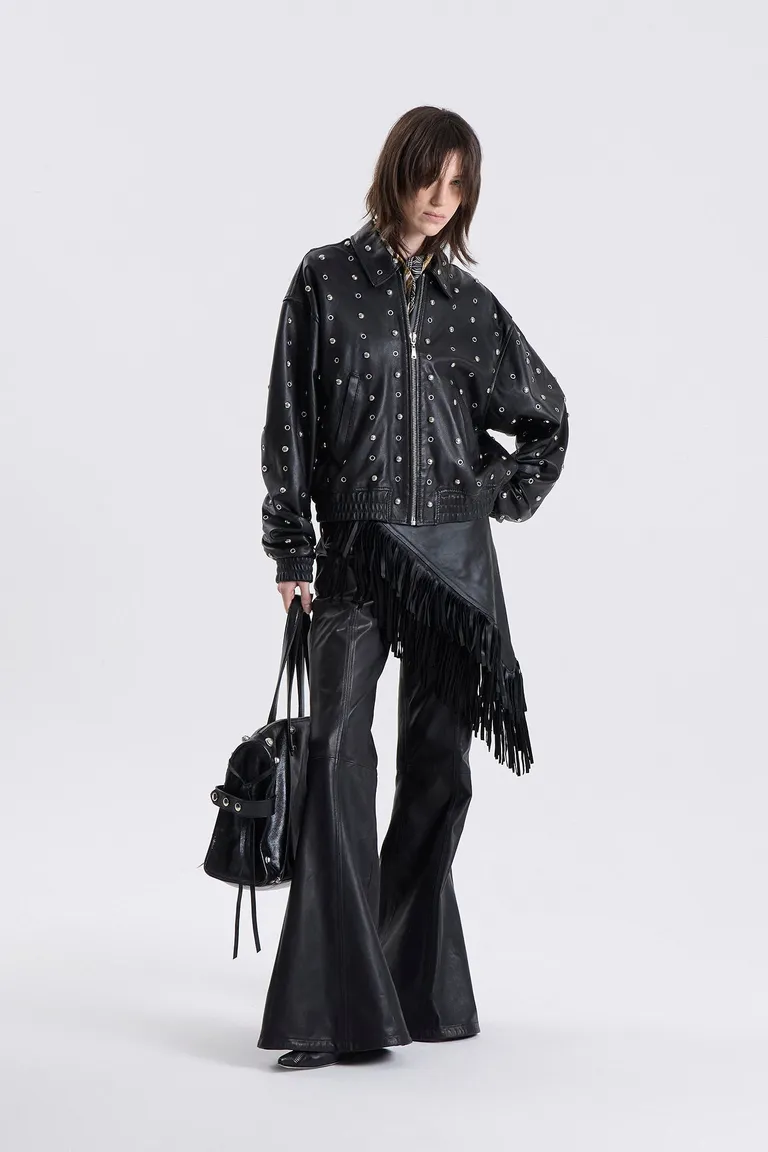 Campera bomber con cierre frontal, cuello clásico y detalles de apliques metálicos distribuidos en toda la prenda de Maria Cher