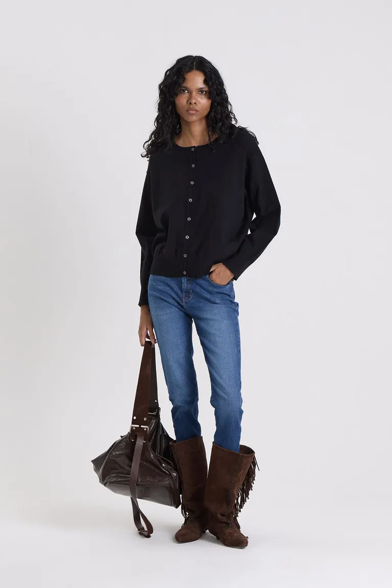 Cardigan de corte clásico con cierre de botones central. Presenta un diseño de tejido con costuras en relieve en las mangas, ideal para complementar distintos outfits en toda temporada. Su versatilidad permite usarlo abierto o cerrado, adaptándose cómodamente a diferentes estilos cotidianos.