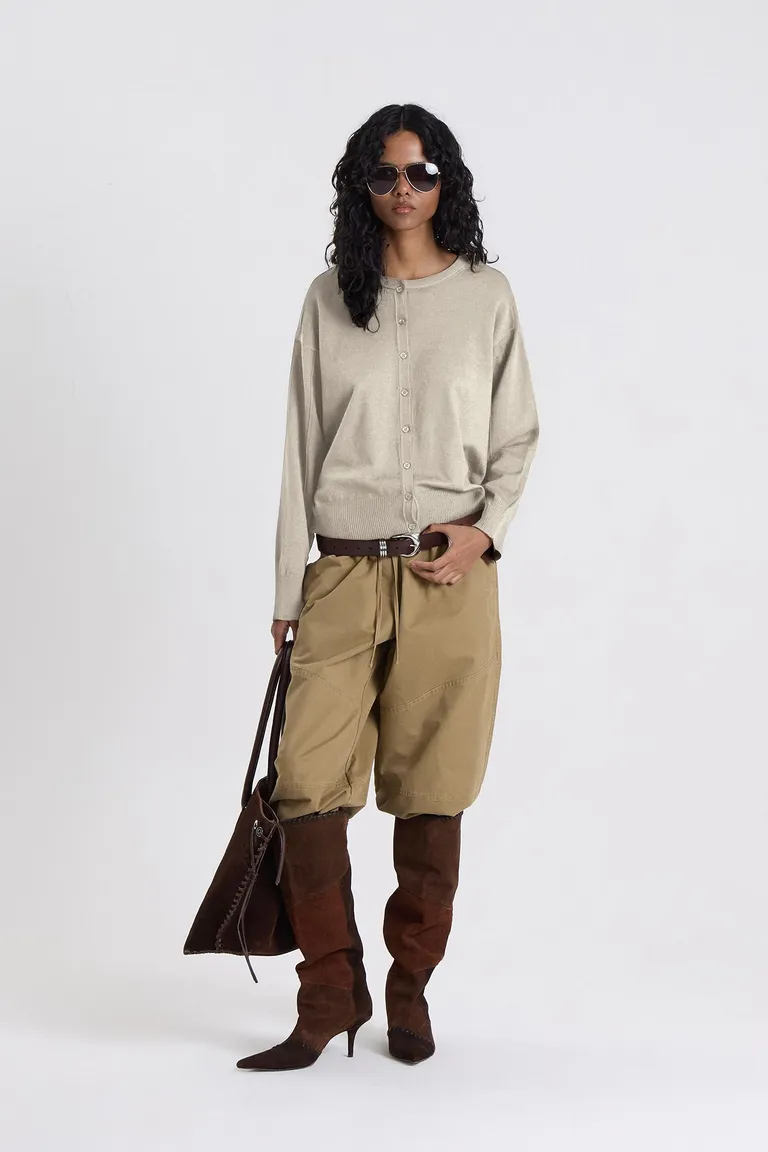 Cardigan de corte clásico con cierre frontal mediante botones y detalles de costuras en relieve sobre las mangas. Una prenda versátil ideal para complementar equipos urbanos con un toque de elegancia y funcionalidad.