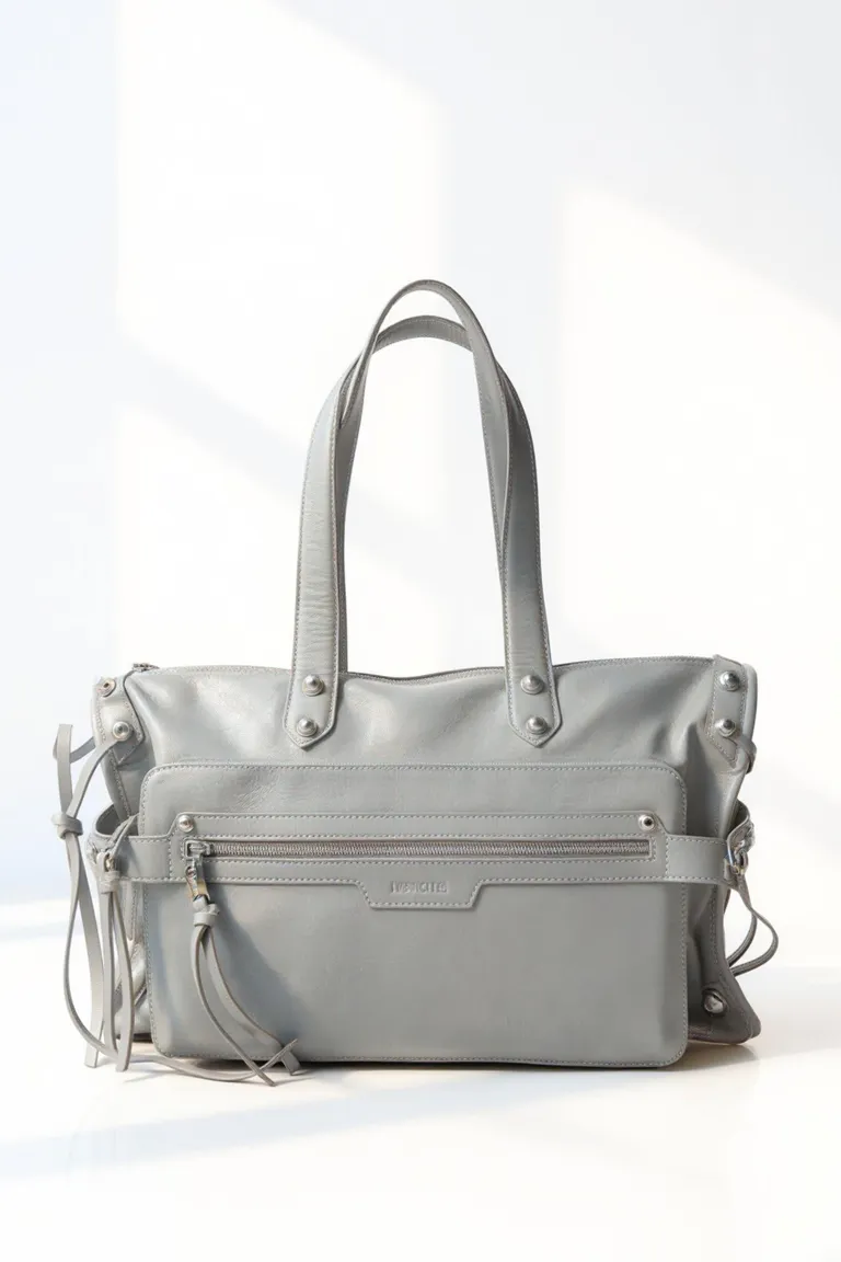 Cartera de tamaño mediano con diseño funcional, doble manija reforzada, compartimento frontal con cierre y detalles de apliques metálicos. Ideal para complementar outfits cotidianos por su estructura versátil y capacidad de guardado.