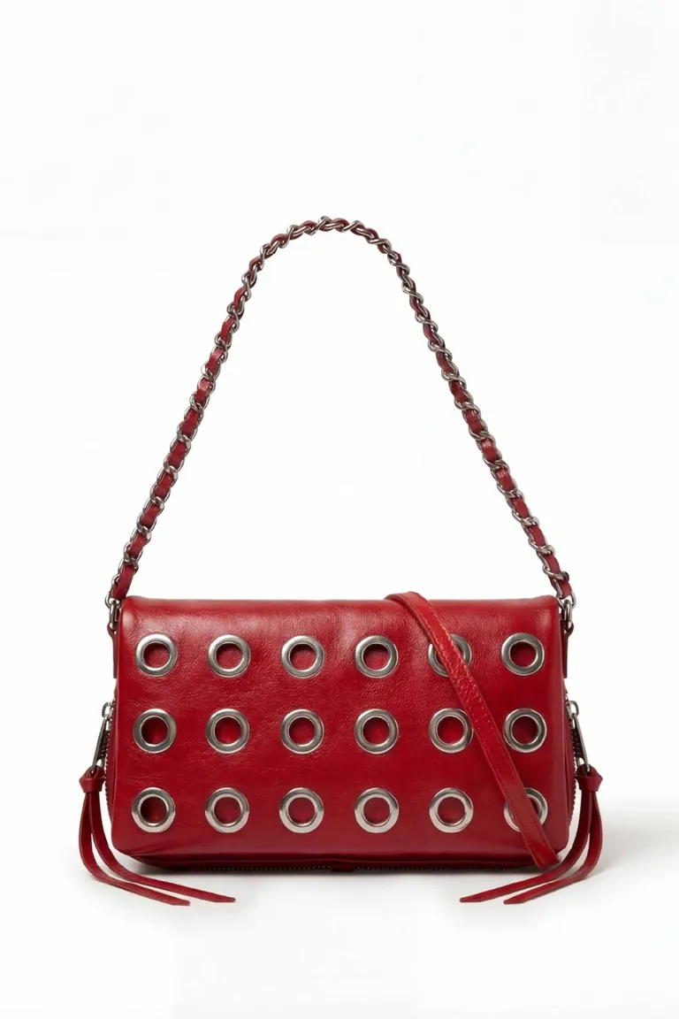 Cartera de diseño estructurado con detalle de ojales metálicos decorativos en la parte frontal. Presenta una correa de cadena distintiva y cierres laterales con tiras colgantes, combinando versatilidad y estilo para el uso diario o eventos especiales. Un accesorio funcional que complementa diversos conjuntos, ofreciendo un perfil moderno con terminaciones metálicas destacadas.