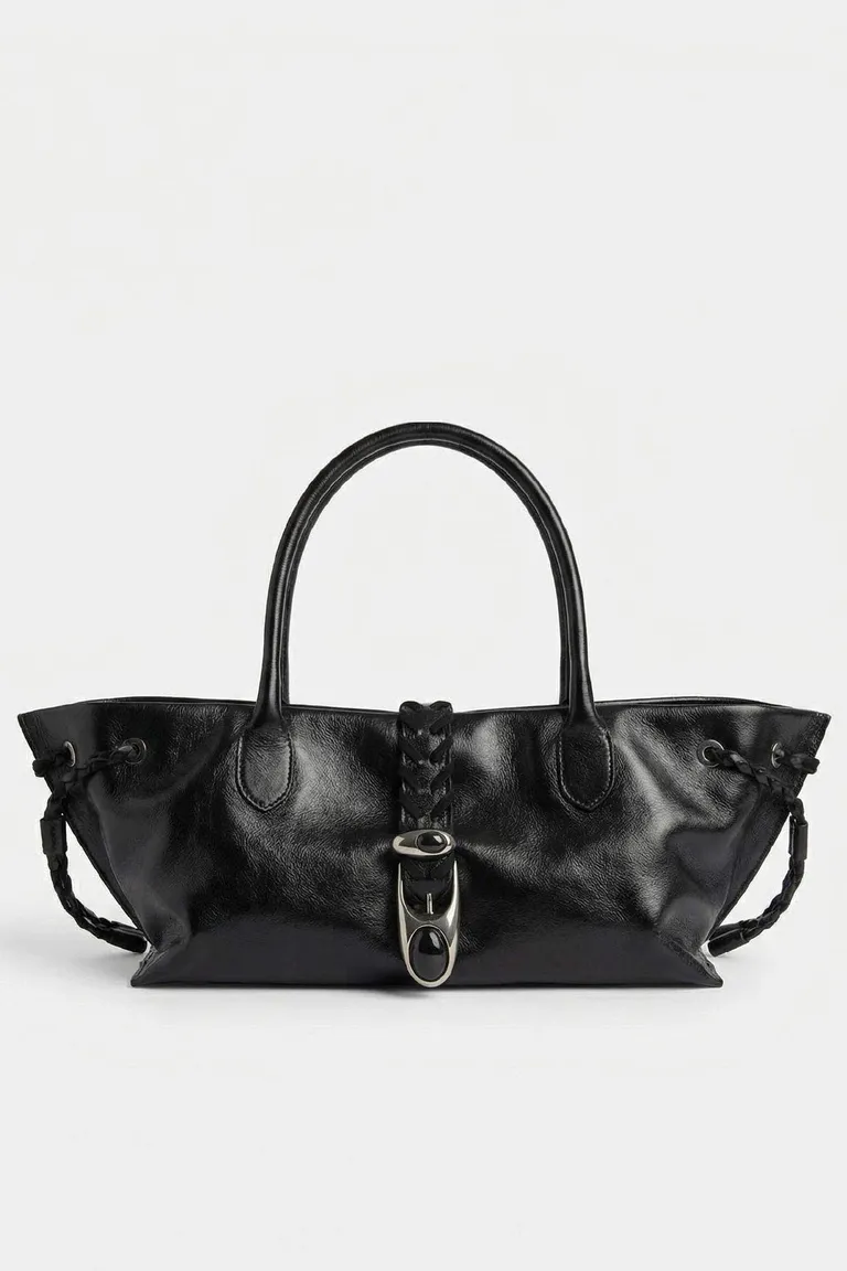 Cartera estructurada con diseño alargado, detalle de hebilla metálica central y correas de mano integradas. Accesorio versátil de estilo moderno, ideal para organizar tus esenciales diarios con un toque distintivo y funcional para cualquier ocasión.