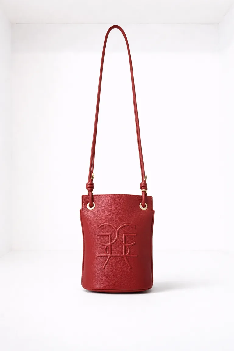 Cartera pequeña de diseño compacto con correa larga para llevar al hombro o cruzada. Presenta un detalle frontal con logotipo grabado y herrajes metálicos circulares que sostienen la correa. Un accesorio funcional y minimalista para complementar outfits diarios con un toque distintivo.