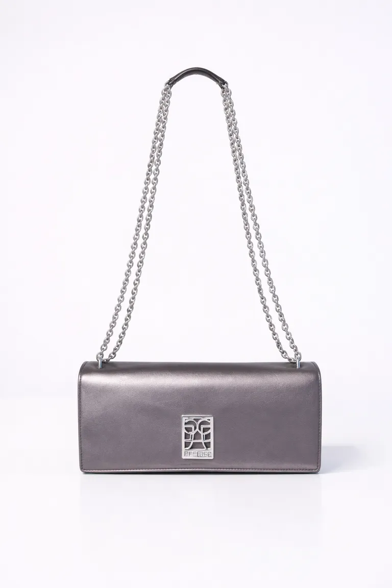 Cartera rectangular con estructura definida, cierre mediante botón a presión y correa de cadena metálica larga. Presenta un aplique metálico central con logo de la marca en el frente y cuenta con un compartimento interno forrado para organizar tus objetos esenciales. Un accesorio clásico y versátil ideal para complementar diversos atuendos.