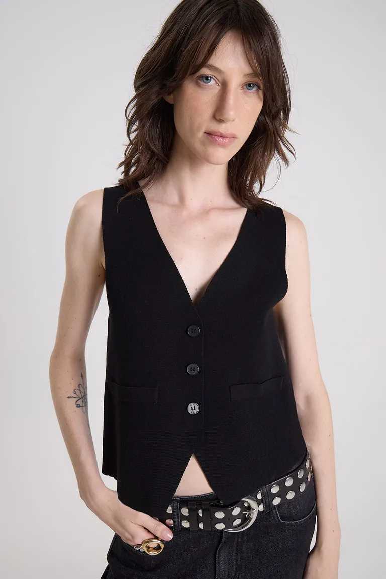 Explorá este chaleco con escote en V y cierre frontal mediante botones, una prenda versátil que se adapta a diversas ocasiones. Con su diseño clásico, es ideal para complementar conjuntos diarios o formales, ofreciendo un calce cómodo y una estructura definida que resalta el estilo personal.