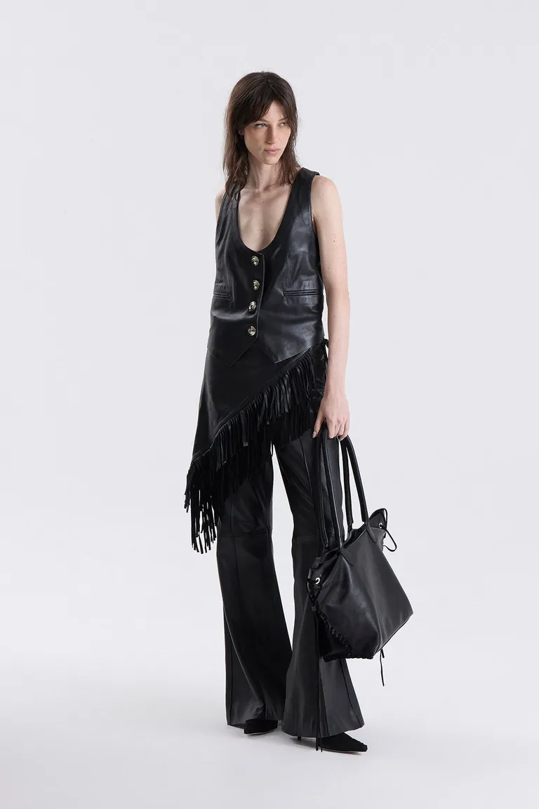 Chaleco sastrero con diseño de corte asimétrico y detalle de flecos en el lateral. Una prenda de estructura definida con cierre frontal de botones, ideal para combinar en diferentes capas y sumar textura a tus outfits diarios, manteniendo un estilo moderno y versátil.