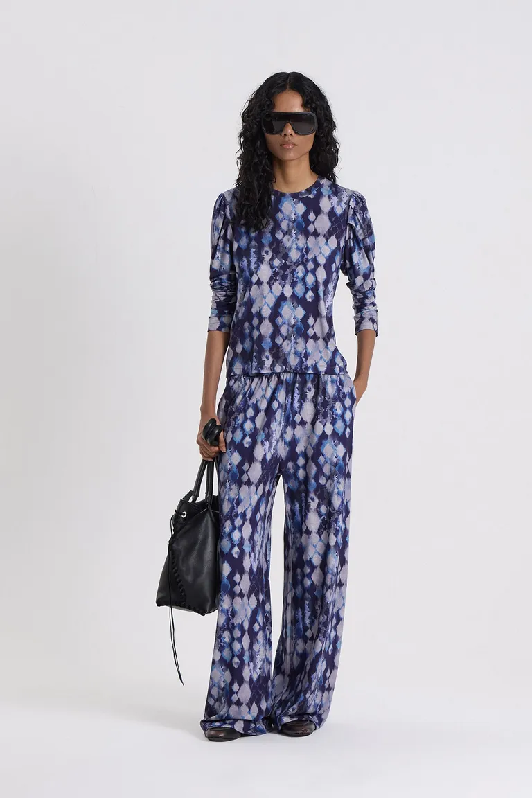 Conjunto de dos piezas compuesto por blusa de mangas largas con detalle de frunces y pantalón de pierna ancha. Presenta un diseño continuo con estampado geométrico que aporta dinamismo a la silueta. Ideal para un look coordinado que equilibra comodidad y estilo en cualquier ocasión, manteniendo una estética fluida y moderna.