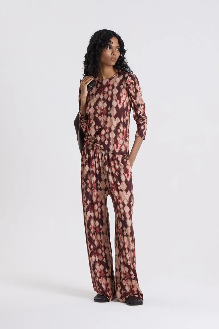 Conjunto de dos piezas compuesto por una blusa de manga larga y pantalón de corte amplio, ambos con un diseño estampado integral. Ideal para disfrutar de momentos de relax con comodidad y estilo. Presenta una silueta fluida que permite libertad de movimiento, siendo una opción versátil y práctica para el uso diario en el hogar.