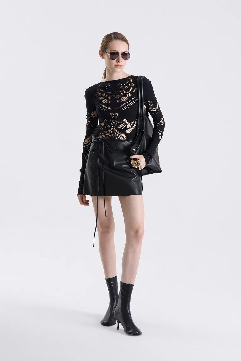 Mini falda con ajuste lateral mediante tiras, diseñada para un estilo moderno y versátil. Esta prenda corta ofrece un corte minimalista ideal para combinar en diferentes ocasiones, aportando un toque de actitud y sofisticación a cualquier conjunto.