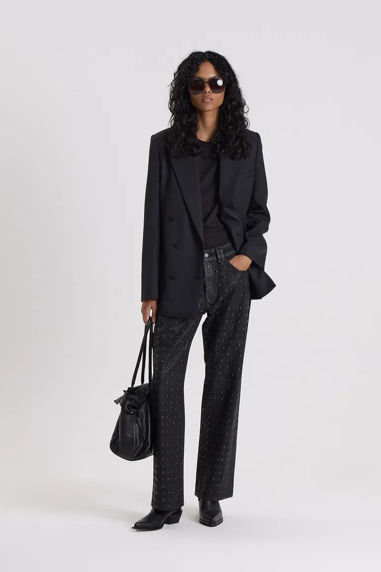 Jean de corte recto con tiro medio-bajo y detalle de tachas hotfix aplicadas sobre la superficie. Presenta una silueta clásica que aporta versatilidad al uso cotidiano, manteniendo un diseño limpio y funcional para combinar en diversas ocasiones. Un ítem esencial con acabado distintivo.