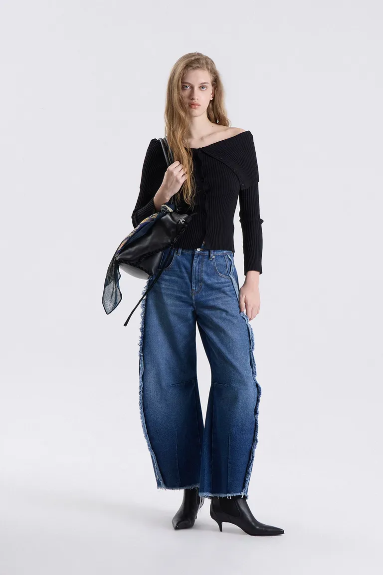 Jean de tiro medio con diseño de silueta curva tipo barril, con recortes y pinzas que aportan estructura. Presenta un ruedo al corte y detalles desflecados en los laterales para un estilo distinguido. Esta prenda permite lograr un calce versátil, ya sea de forma más holgada o ajustada, ideal para combinar con diversas propuestas de vestuario diario.
