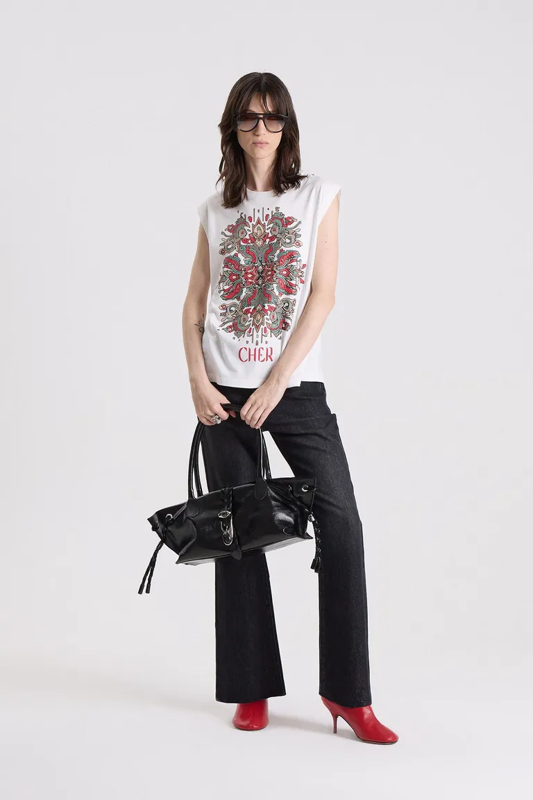 Remera de corte sin mangas con escote redondo, presenta un diseño estampado en la parte frontal. Es una prenda versátil ideal para combinar en diversos outfits diarios.