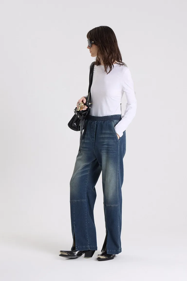 Pantalón de estilo holgado con cintura elastizada, bolsillos laterales y detalles de recortes verticales en el frente y las rodillas. Presenta una apertura en la botamanga y un efecto visual desgastado tipo denim que aporta una estética relajada y moderna para el día a día.