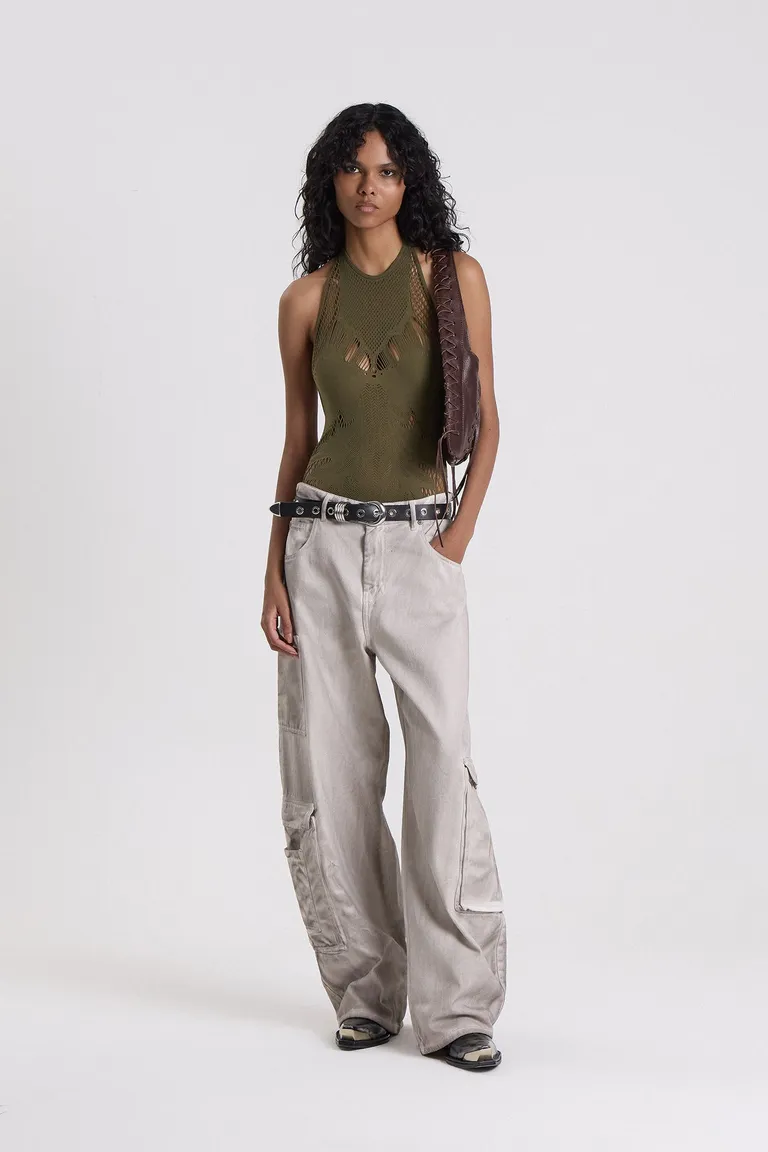 Pantalón de calce amplio con tiro medio-bajo y diseño de piernas con curva sutil. Incluye bolsillos laterales tipo cargo que aportan funcionalidad y un estilo relajado. El acabado presenta un efecto visual desgastado con tonalidades irregulares que resaltan su carácter distintivo. Ideal para lograr un look urbano y cómodo con un aire contemporáneo.